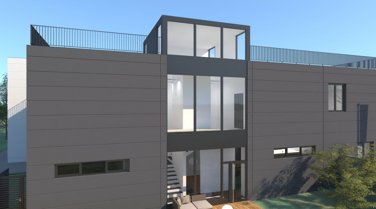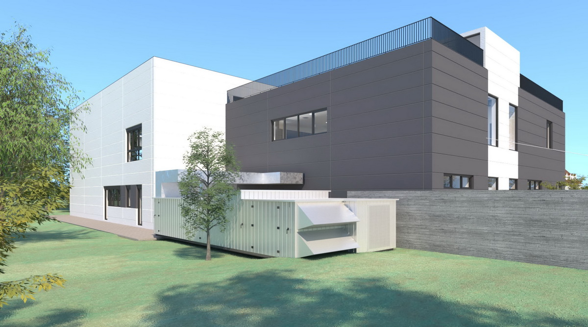 Das Lüftungsgerät ist auf der Gebäuderückseite untergebracht und versorgt alle Bereiche mit Frischluft.