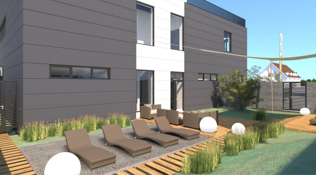 Das verglaste Treppenhaus sprengte dann leider den finanziellen Rahmen und es wurde als Lochfassade mit den Ytong-Steinen ausgeführt. Das tut dem Wellnessgarten aber keinen Abbruch.