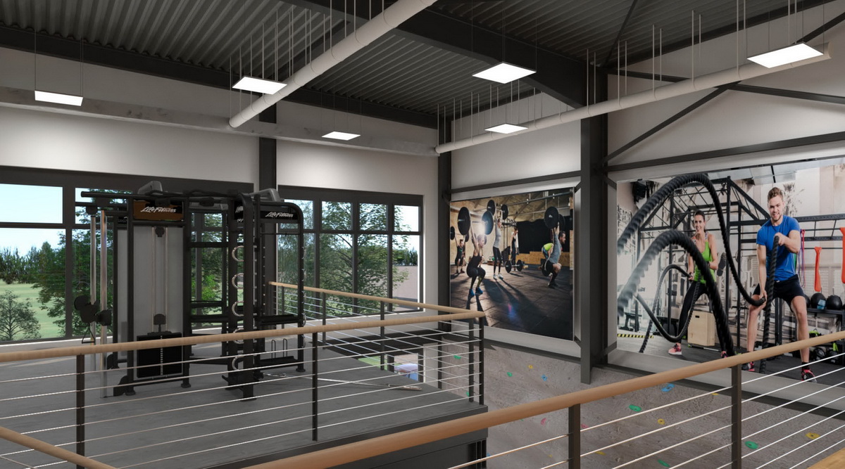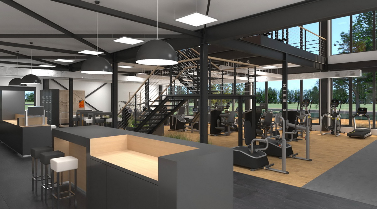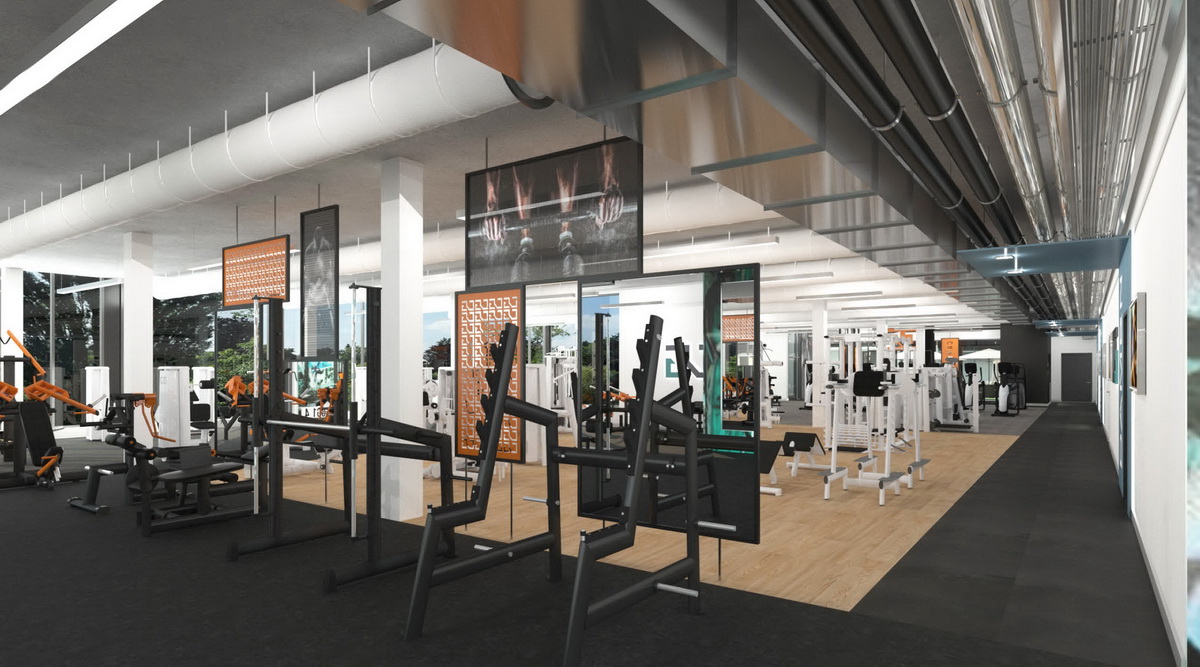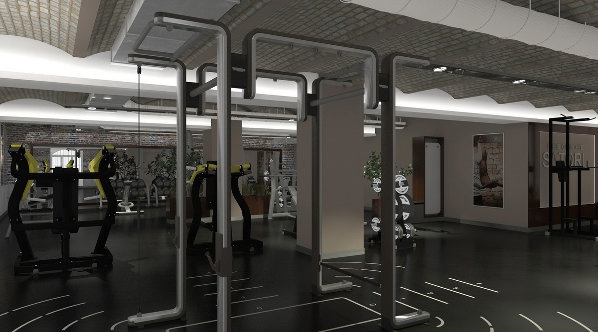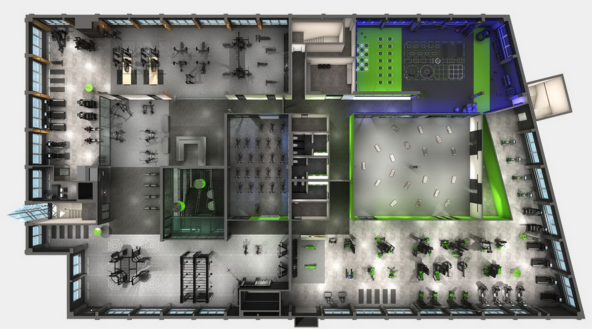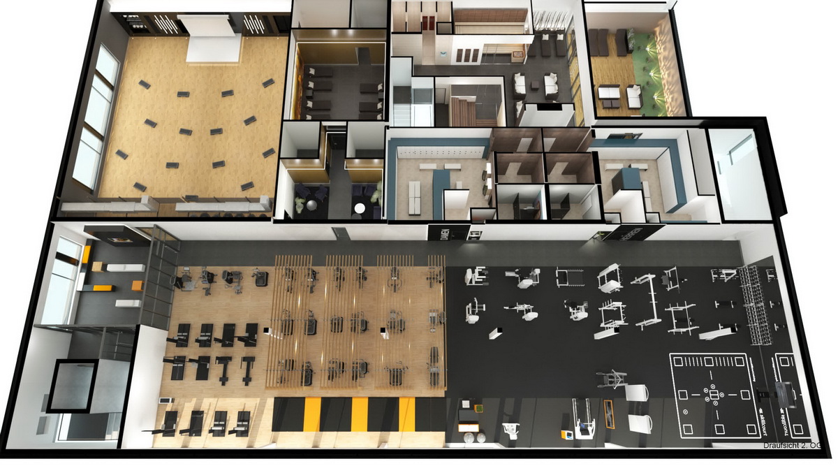 … im 1. OG auf den wir hier blicken, gibt es ein komplettes Gym mit Free Weights, Stand Alone und Cardiogeräten. Außerdem Yogaraum, Umkleiden mit Solarien und Zugang zum Saunabereich über eine interne Treppe.