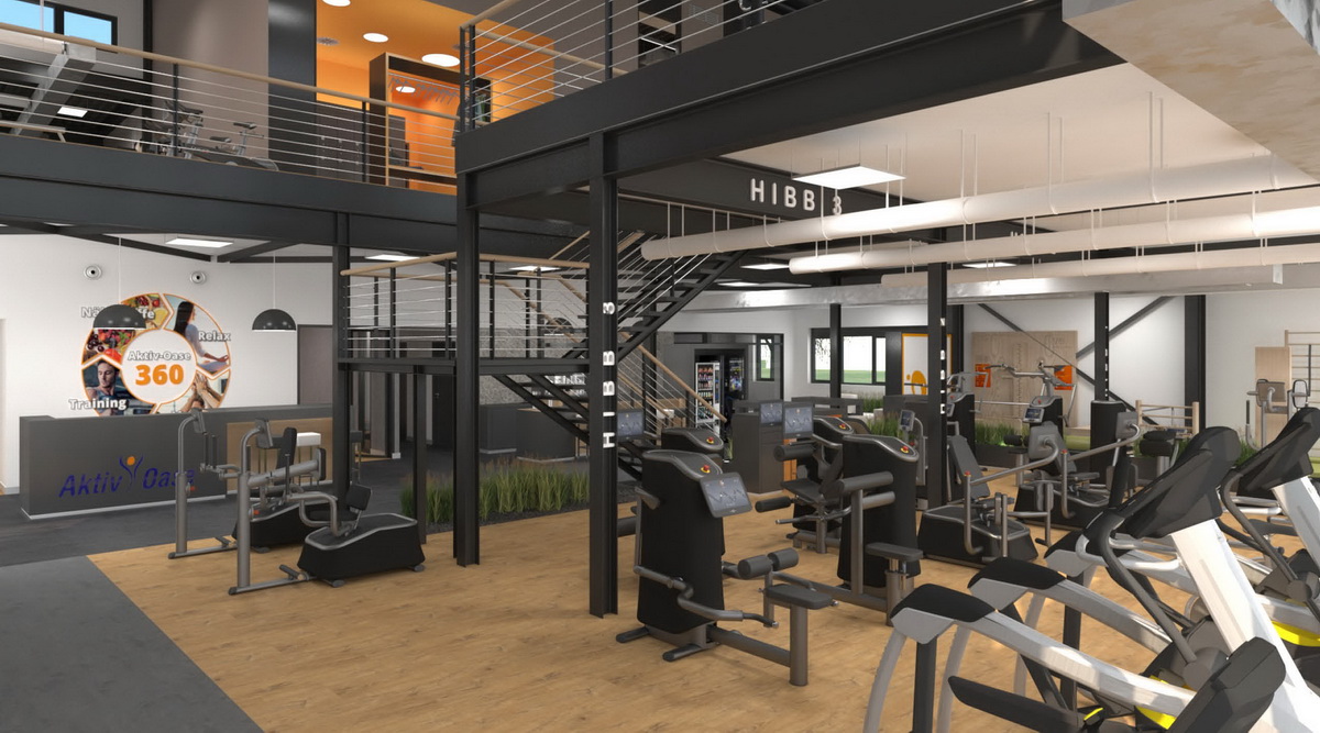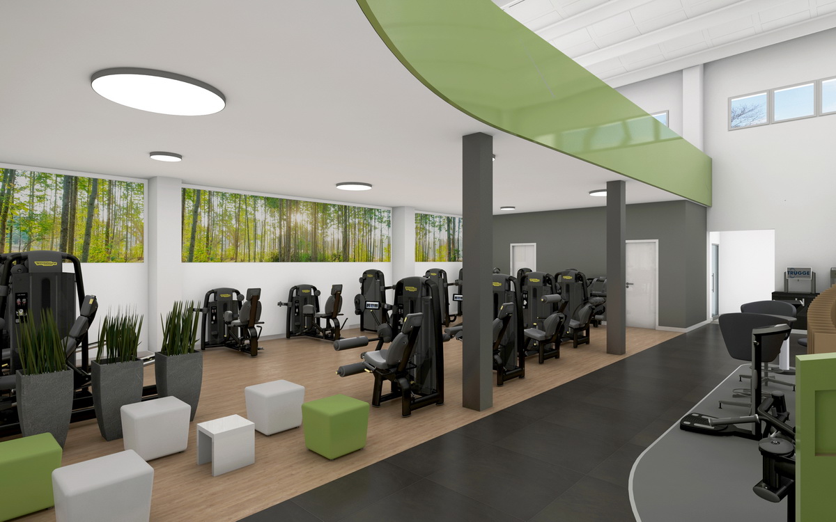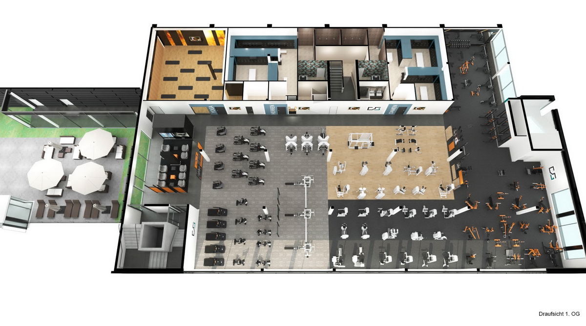 Im 1. OG ist der Umkleidetrakt, die Trainingsfläche und der Cyclingraum untergebracht.