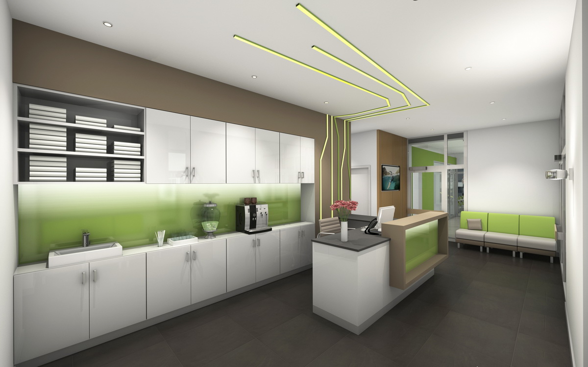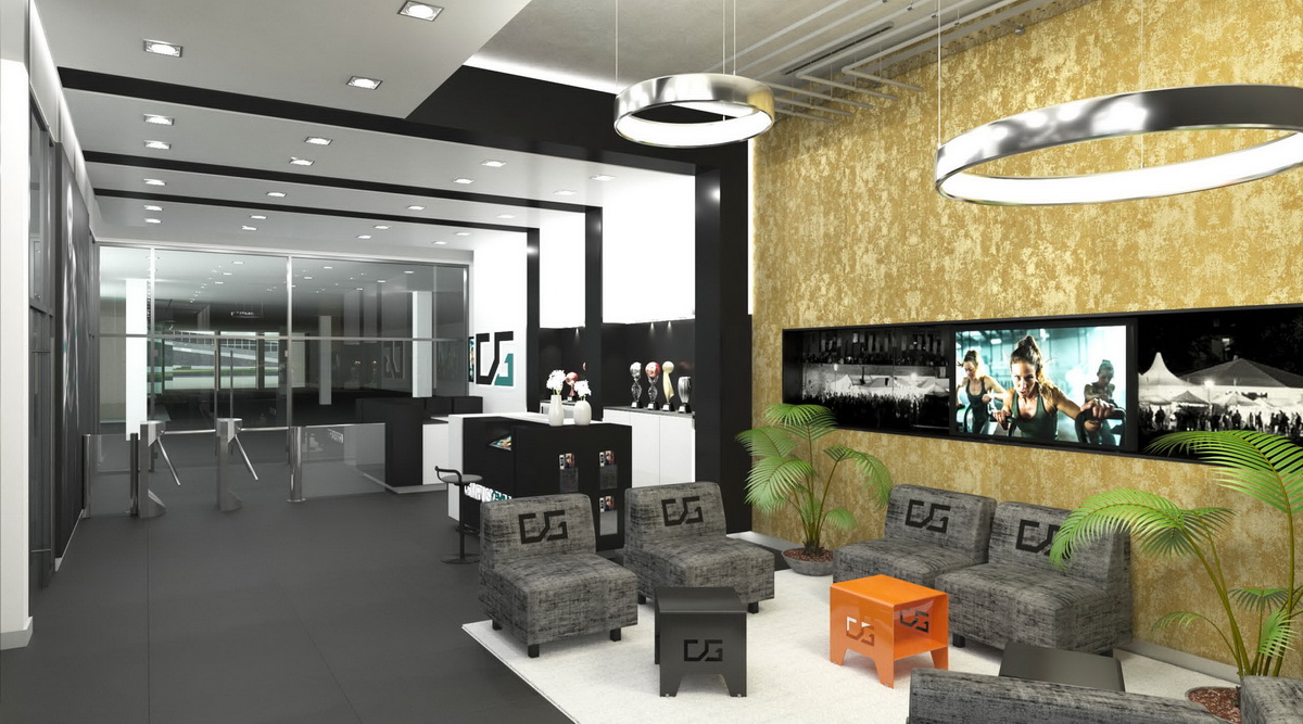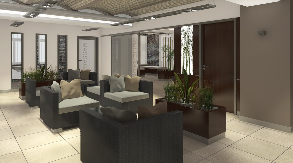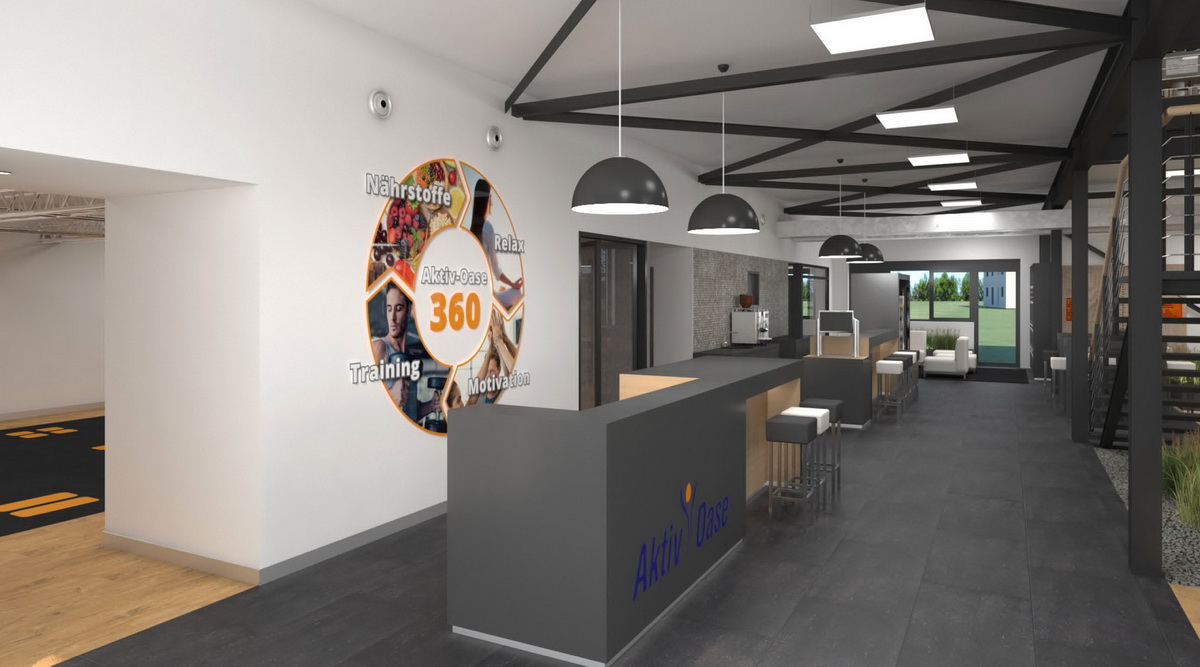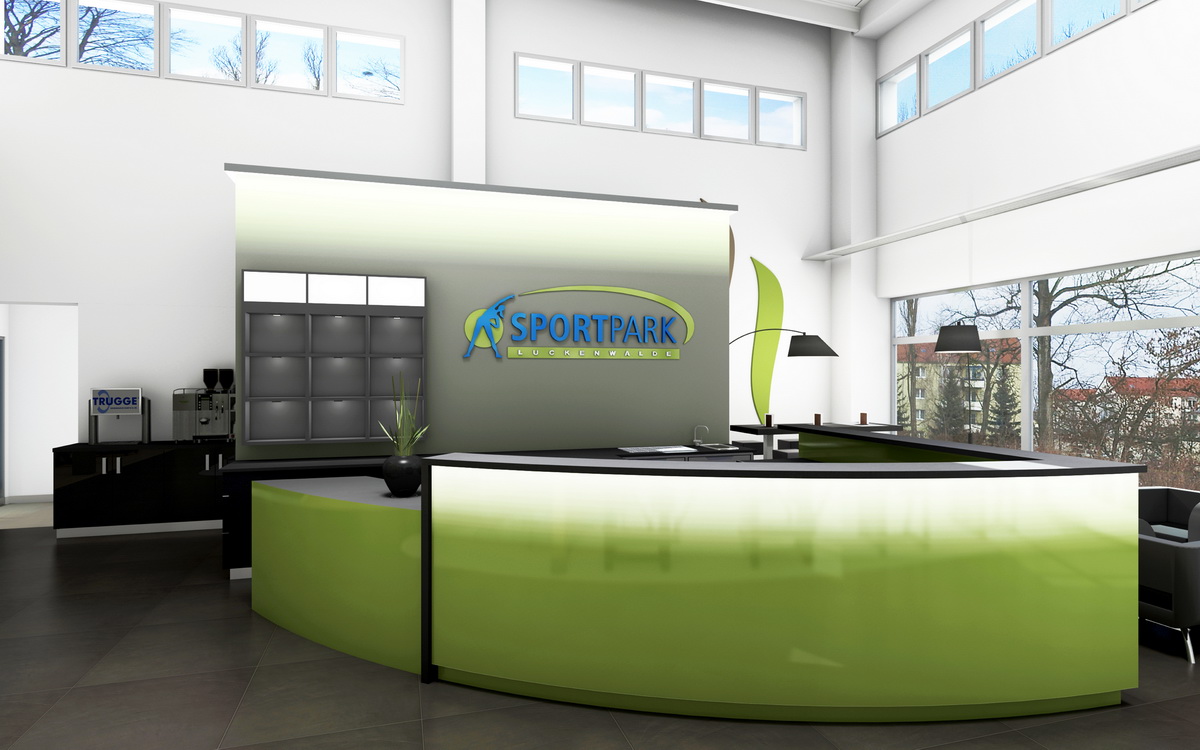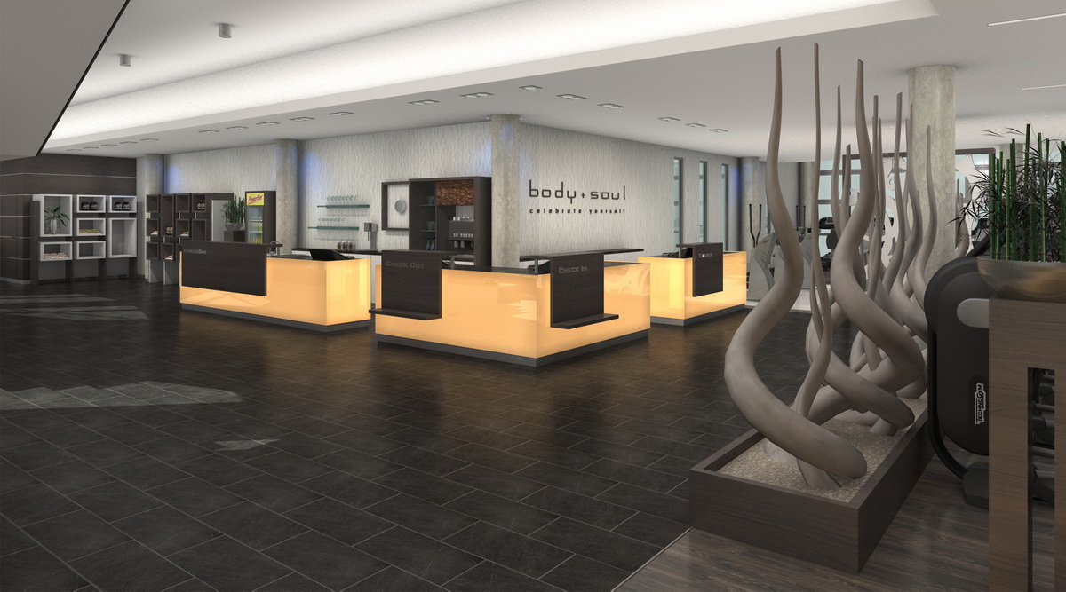Im Münchner Norden haben wir 2011 mit der Planung einer weiteren body+soul Anlage begonnen – Eröffnung war Anfang Mai 2014. Das Bild zeigt ein Rendering vom Empfang.