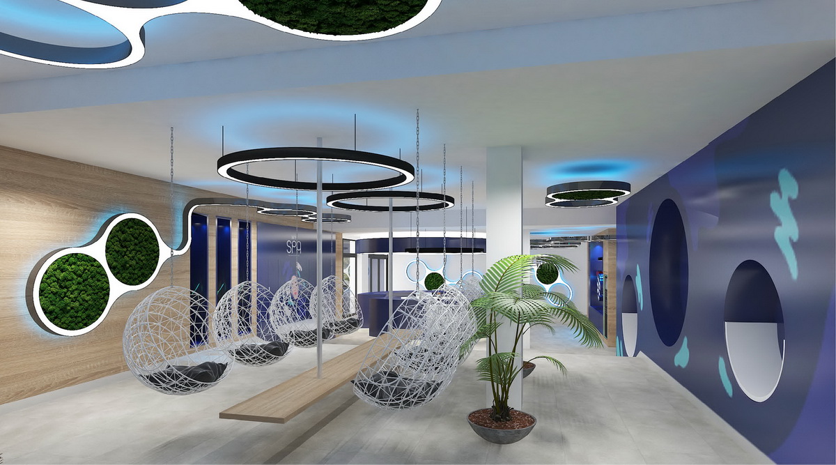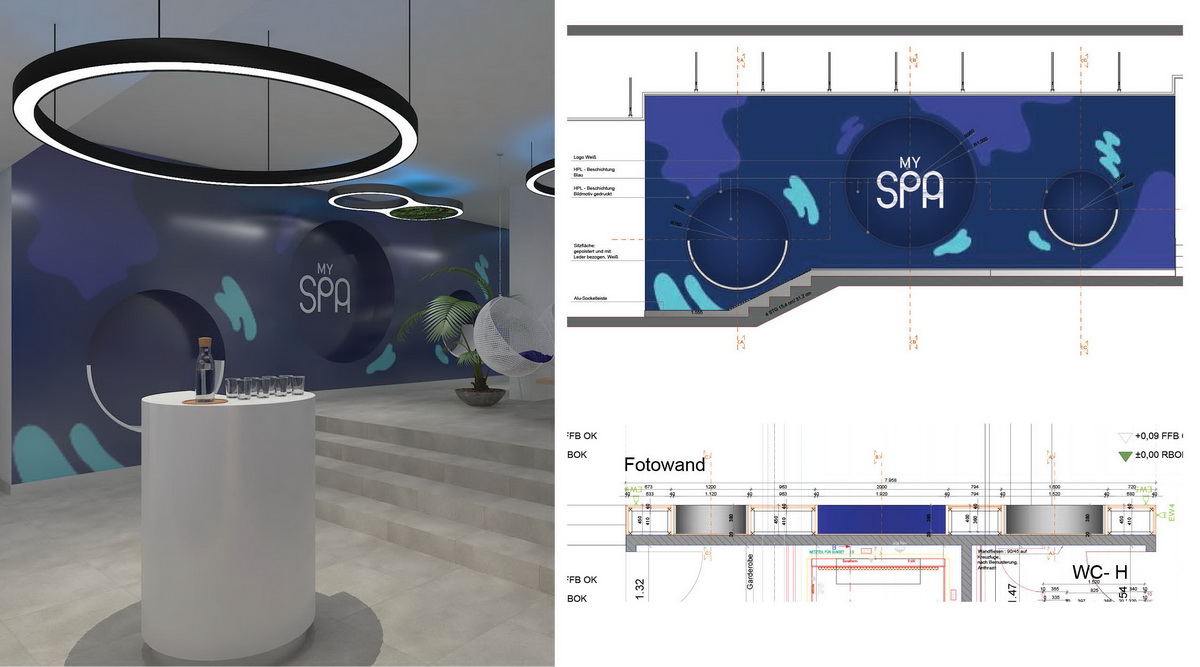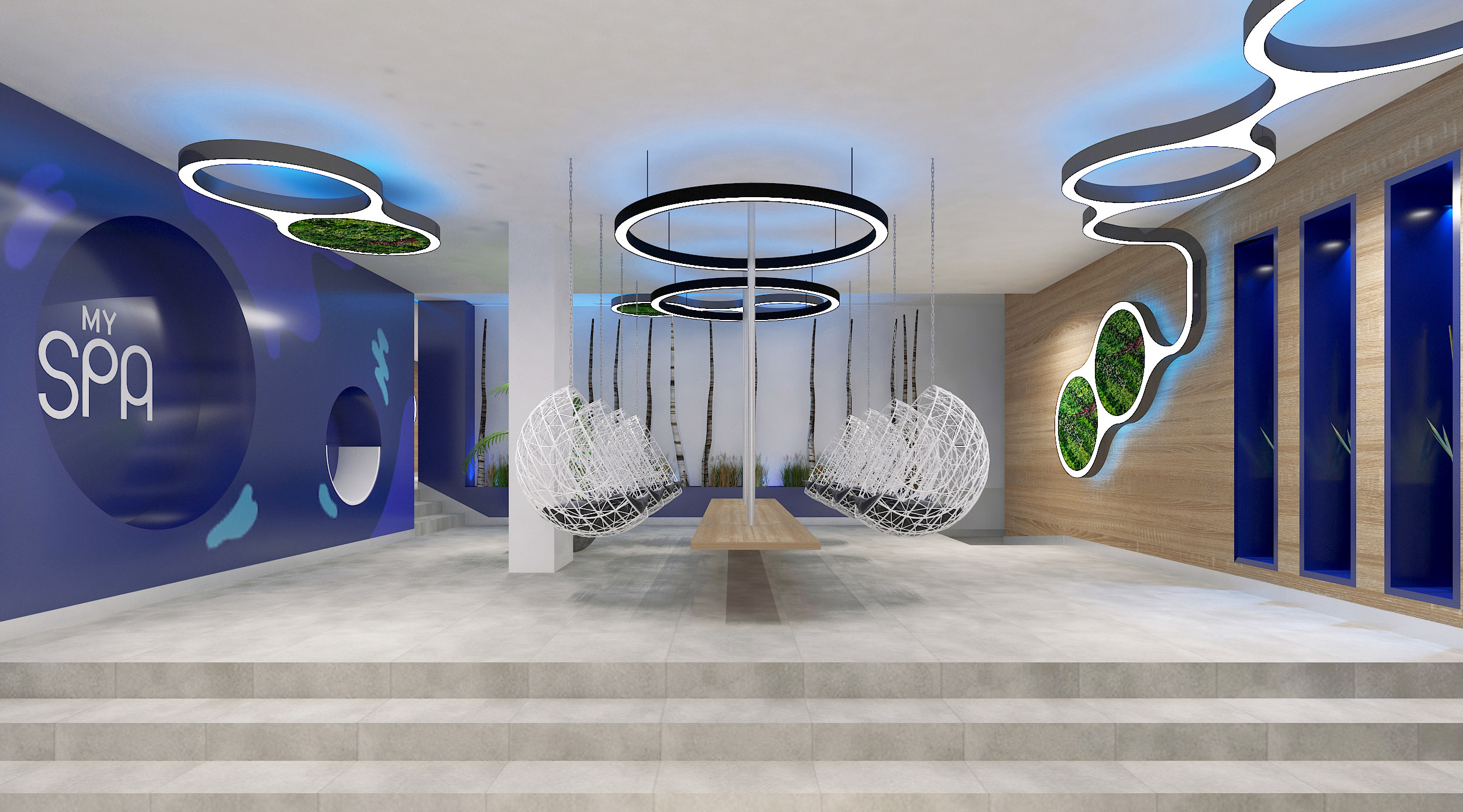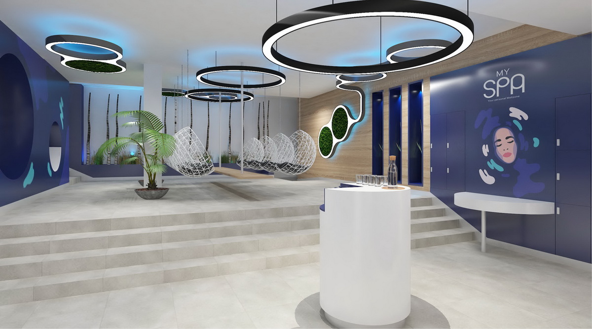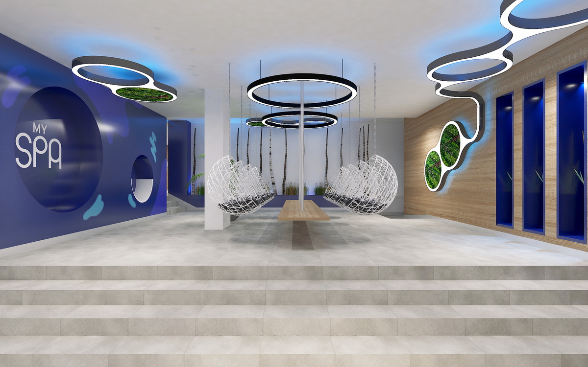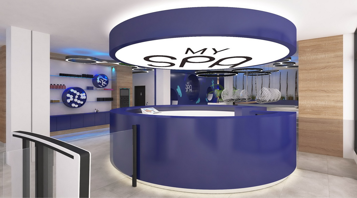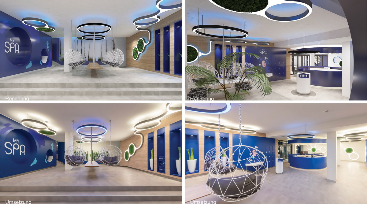 Das Gestaltungskonzept der Innenarchitektur und das CI von MySpa wurden parallel entwickelt: Der Kreis und die Farbe Blau bilden die Hauptelemente sowohl für die WellZones als auch für Empfang und Lounge.