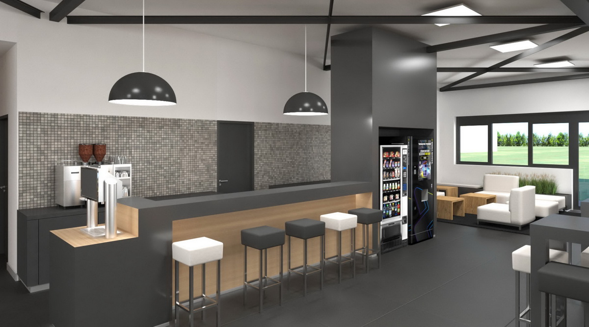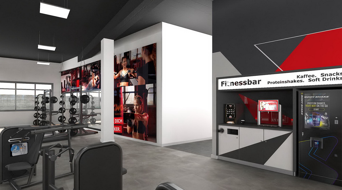 Im EG und 1. OG kann man auch Kaffeespezialitäten und ein umfangreiches Softdrink Angebot sowie Eiweißshakes genießen. Die SB-Bar haben wir in einer Wandnische integriert und das dreckige Geschirr kann über eine Durchreiche direkt auf der anderen Seite der Wand vom Personal in die Geschirrspülmaschine geräumt werden.