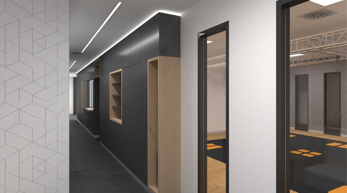 Unterhalb des 24h-Studios ist die Physiotherapie angeordnet. Hier haben wir für den Gang einen multifunktionalen Schrank mit viel Stauraum und dem benötigten Waschbecken entworfen.