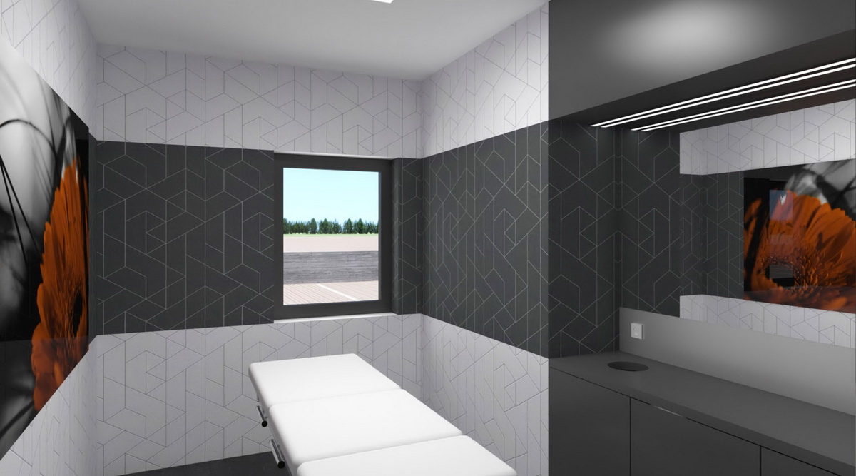 Im Behandlungsraum haben wir bei der Raumgestaltung die Fensterhöhe aufgenommen, um eine Stimmigkeit für das Auge zu erreichen.