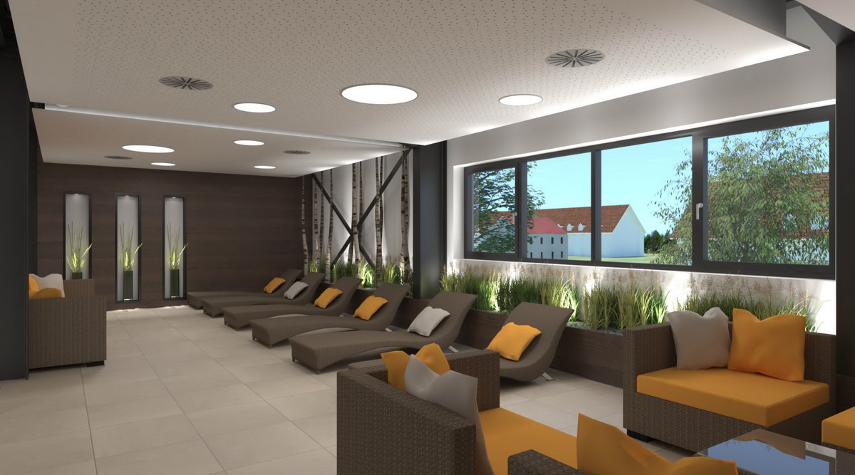 Für den Ruheraum vor der Sauna gibt es viele Gestaltungsideen. Es konnte sogar eine kleine Terrasse realisiert werden. Der Empfangstresen nimmt die gebogene Form der Wegführung auf und ist optisch von der dahinterliegenden SB-Getränkebar getrennt.