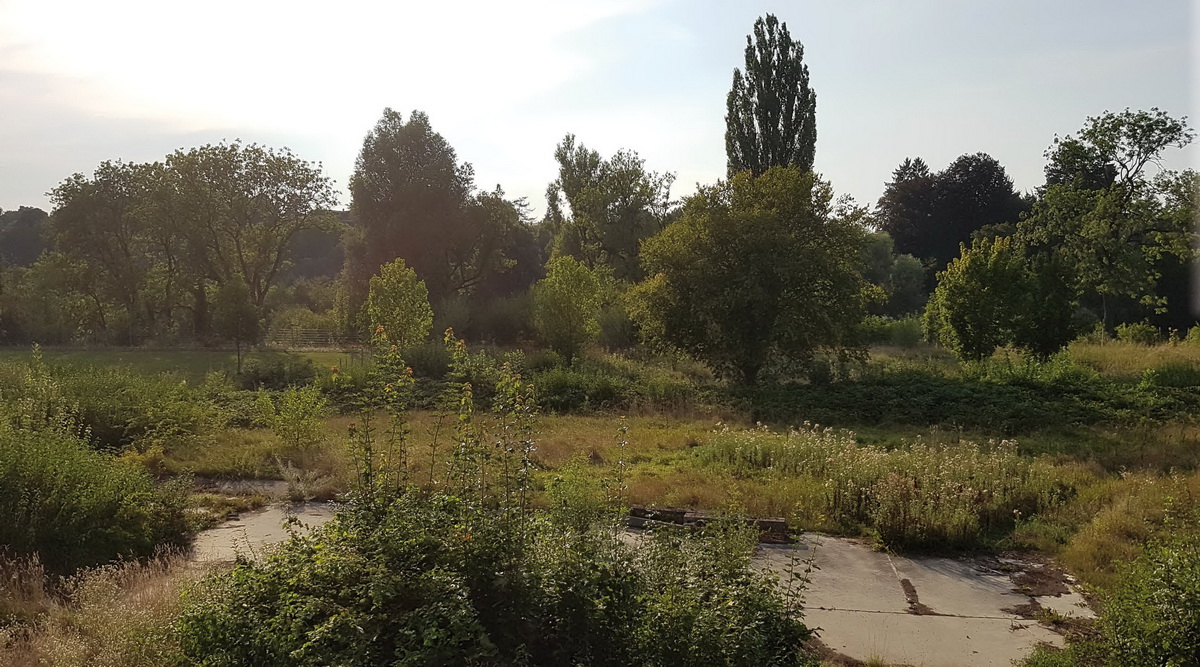 …auf diesem Bild von dem noch nicht bebauten Grundstück hat sie sich hinterm Deich versteckt. Das schöne Areal am Fluss lag über 10 Jahre brach.