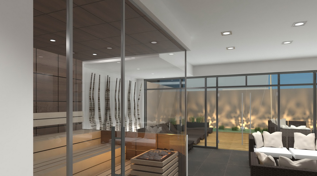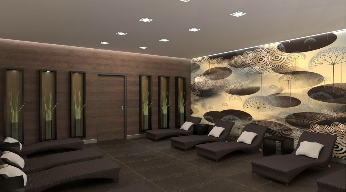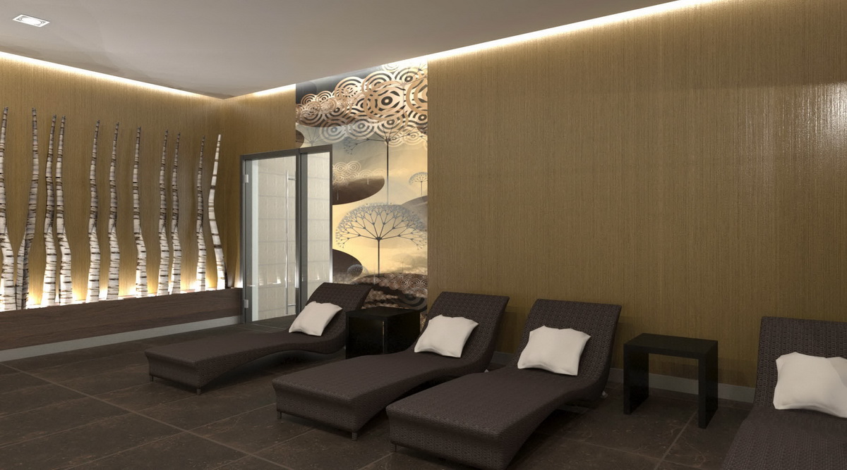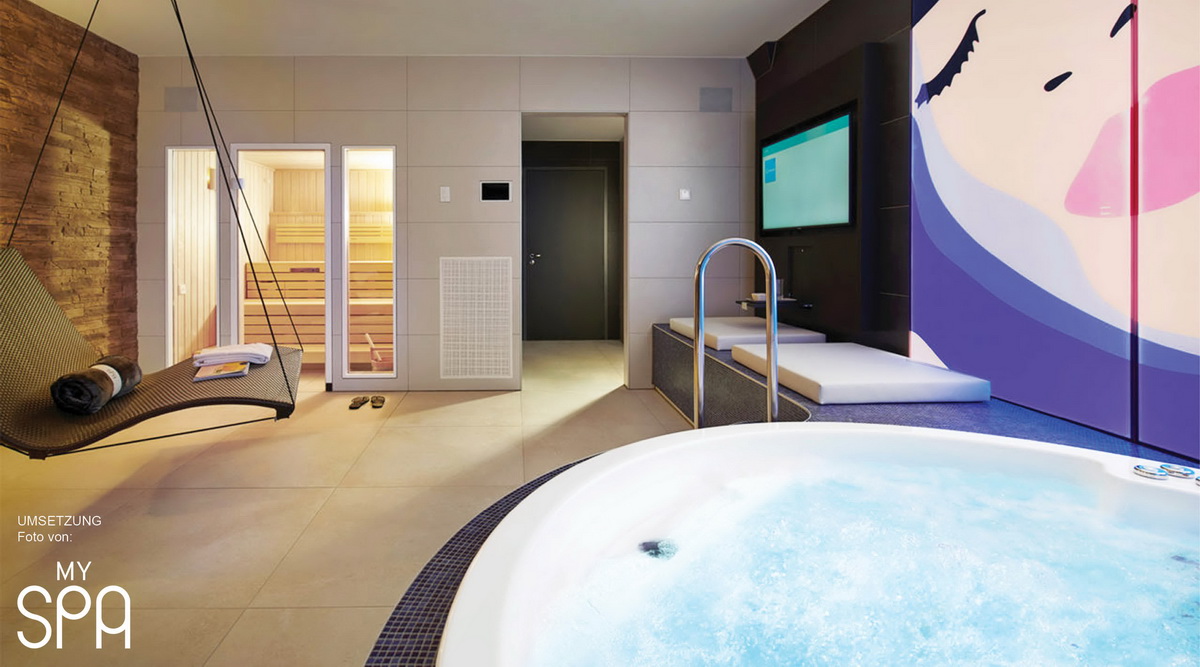 Der Nutzer kommt durch den Vorraum in die Wellzone, wo er sich in absoluter Privatsphäre erholen und entspannen kann. Ein Highlight des Spa-Bereichs ist mit Sicherheit der Whirlpool, der von einer hinterleuchteten bedruckten Glaswand umgeben ist.