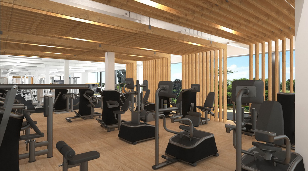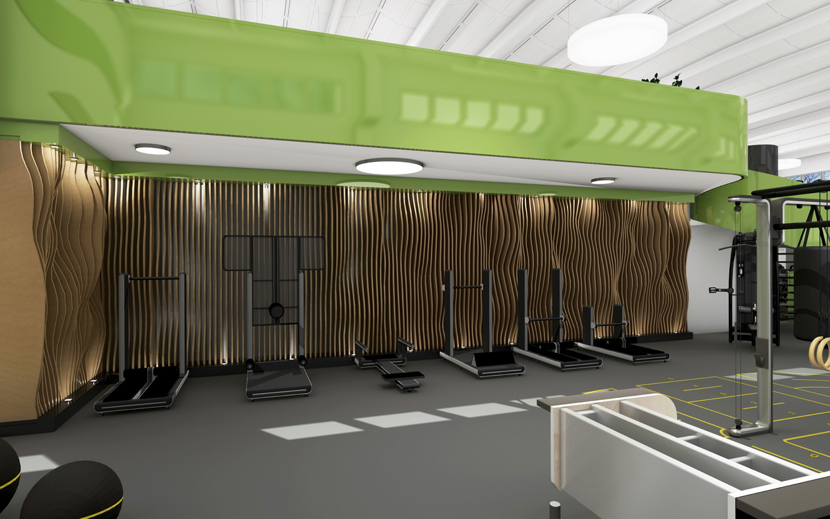 Ein besonderes Highlight sind auch die L-förmigen Holzpaneele, die über dem kompletten eGym Trainingsbereich gespannt sind und diesem damit eine hohe Wertigkeit verleihen.