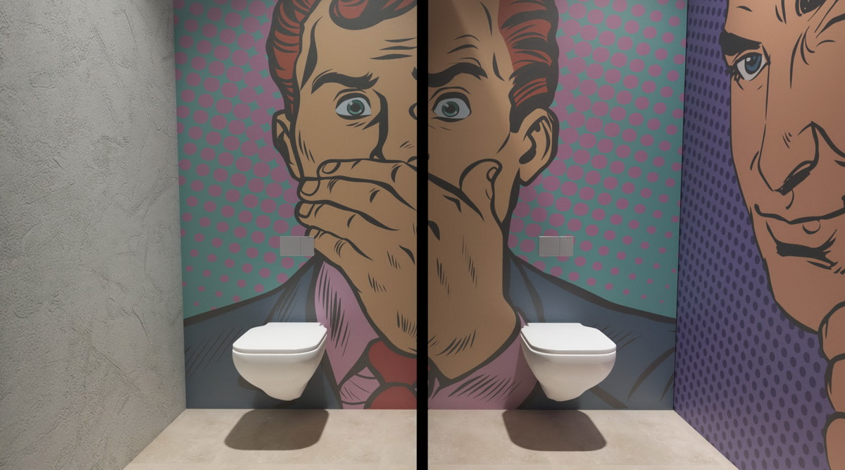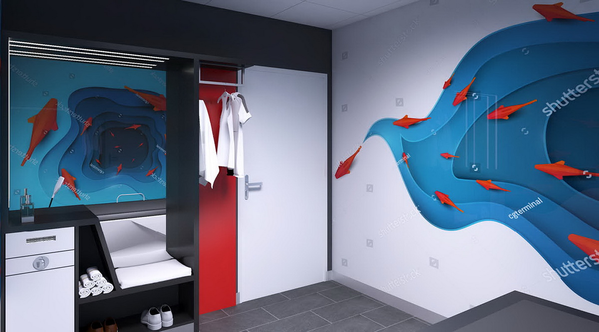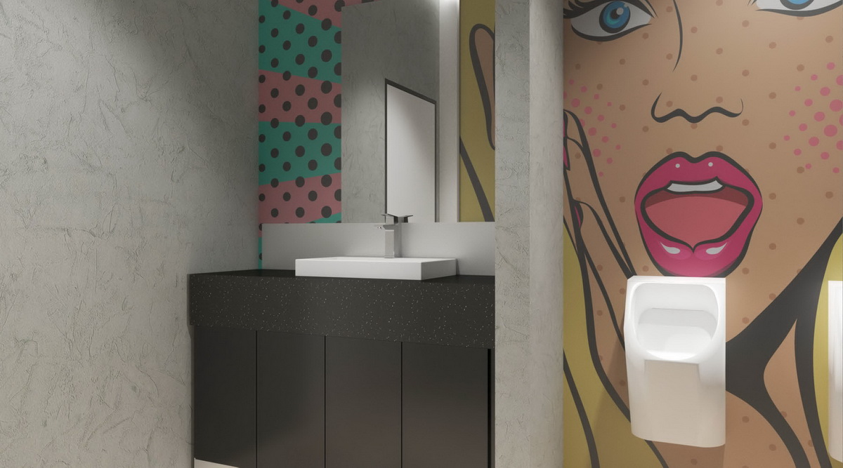 Die Wandflächen sind mit grafisch bedruckten Aludibondplatten ein absoluter Hingucker und zudem pflegeleicht.