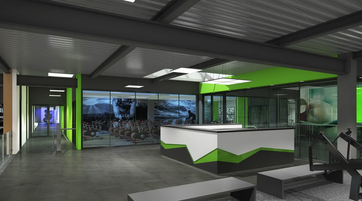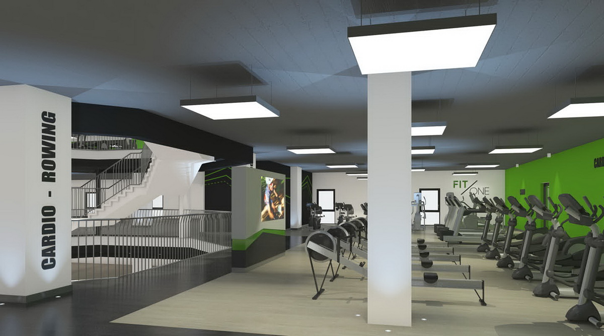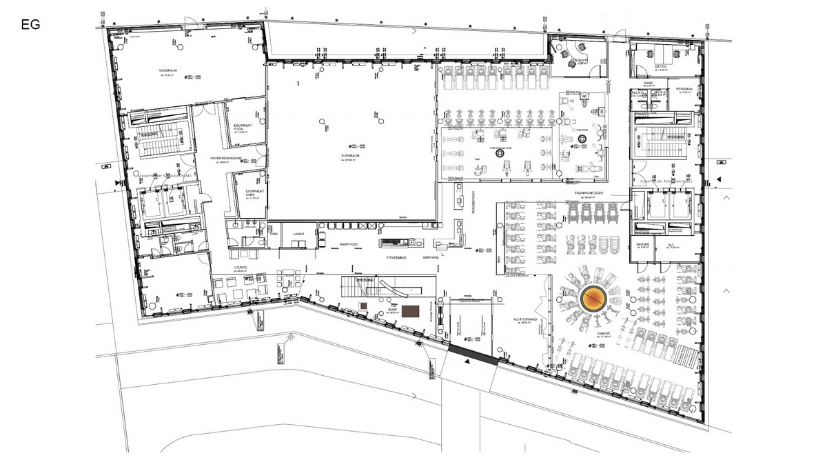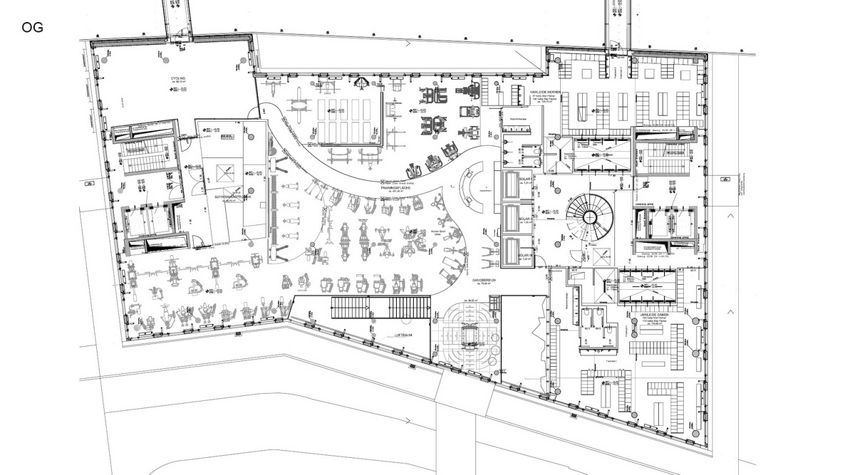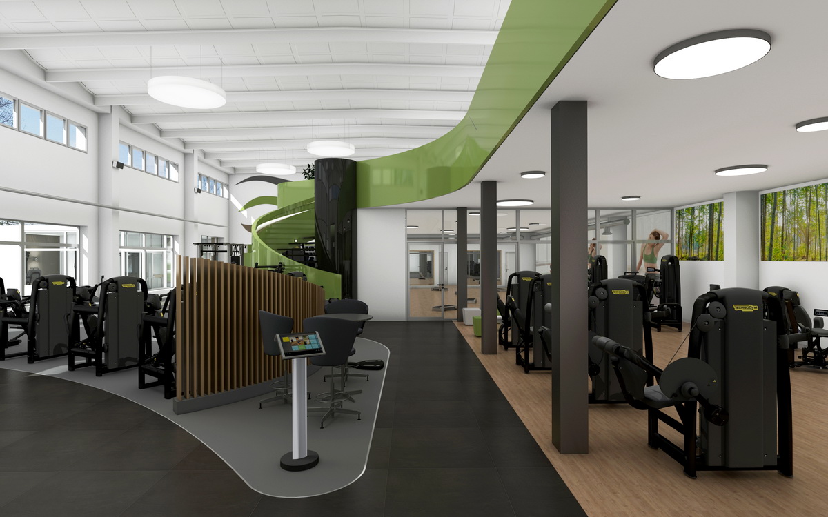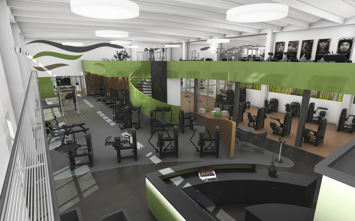 Im Erdgeschoss bestand die Herausforderung, einen möglichst großen Kursraum mit wenig Stützen zu schaffen. Die Cardio-Trainingsfläche, der Empfang mit Fitnessbar, Shop, Lounge und Kinderbetreuung sind drumherum angeordnet.