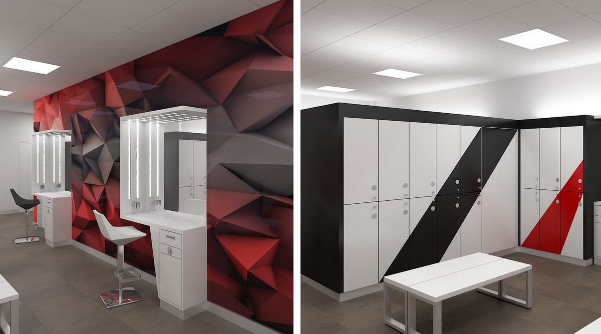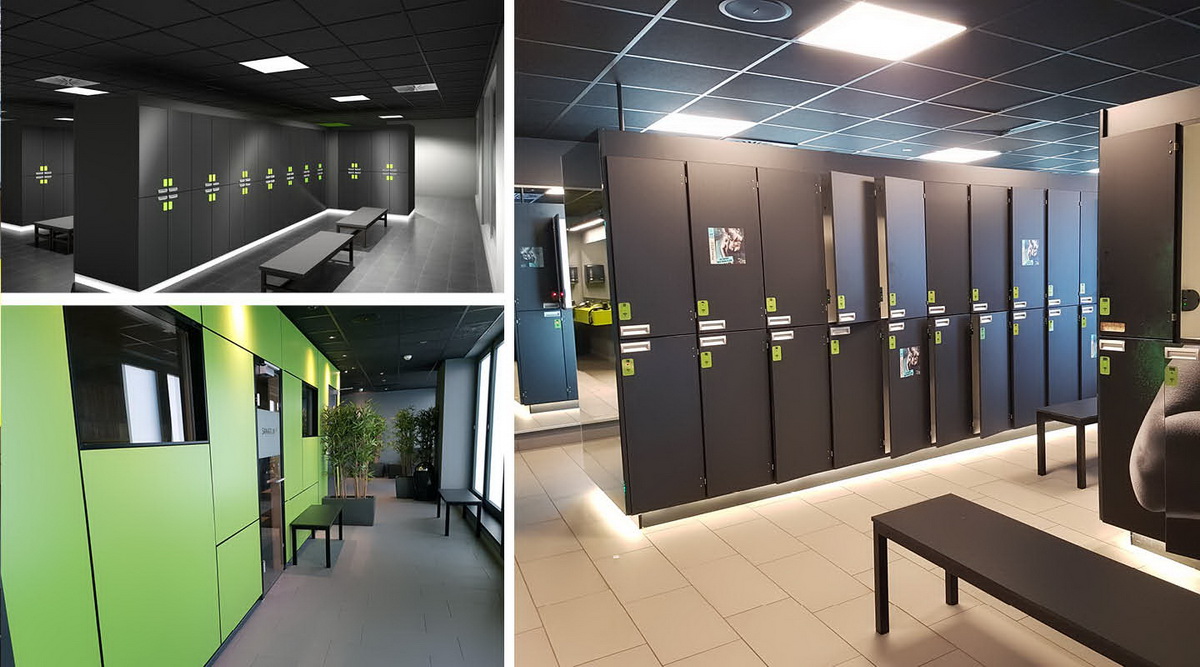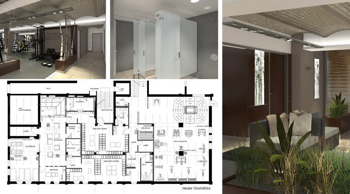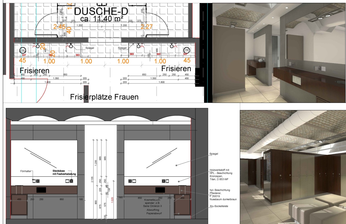 Links oben ein Rendering von der Umkleide, rechts ein Foto der Umkleideschränke. Links unten ist ein Foto der Saunaverkleidung zu sehen.