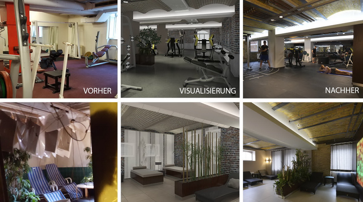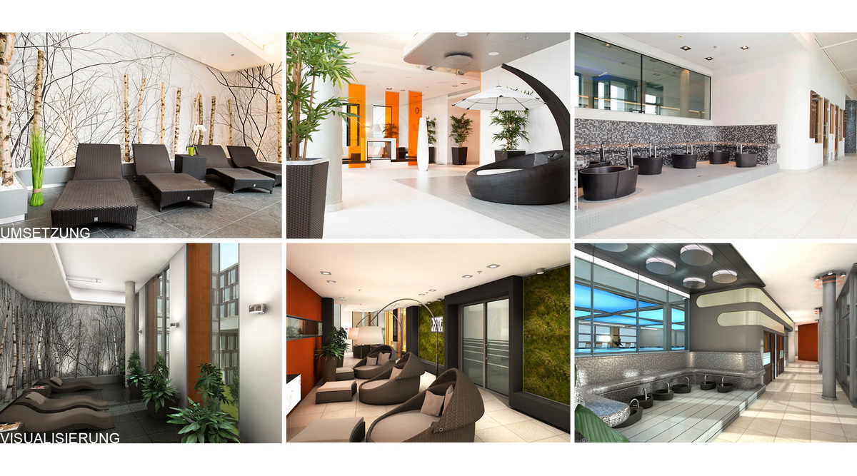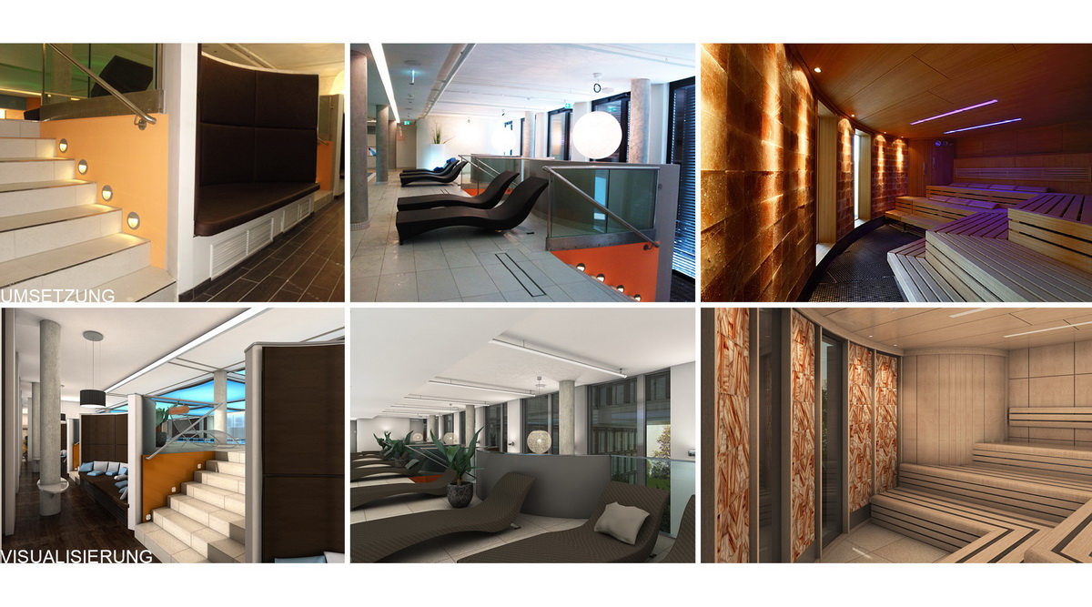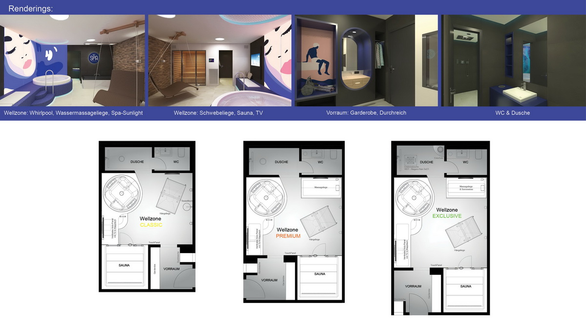 Auf ca. 1300 m² werden drei unterschiedliche Kategorien angeboten: Classic, Premium und Exclusive. Für jede WellZone haben wir individuelle Lösungen entwickelt, um die unregelmäßige Stützenanordnung zu integrieren. In jeder WZ stand mindestens eine Stütze im Weg.