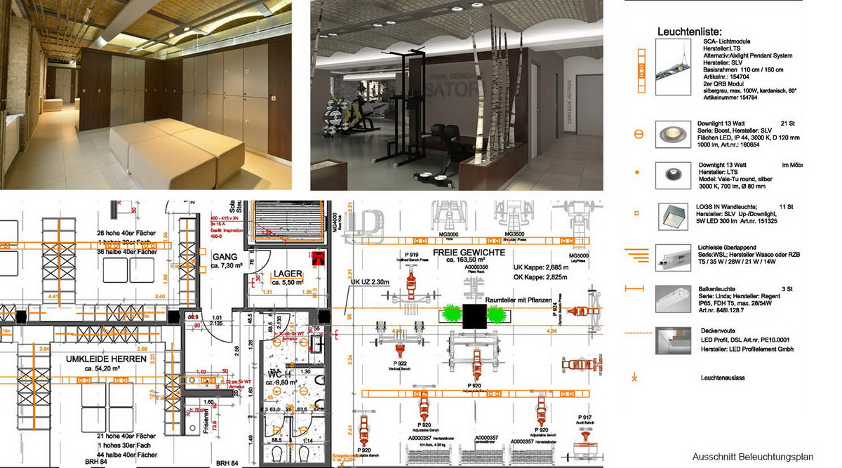 Genauso gingen wir mit der Beleuchtung vor. Die Entwicklung des Beleuchtungskonzeptes erfolgt über die Visualisierung, das Ergebnis wird dann in die Planung eingearbeitet und die Bemusterung der Leuchten in einer Legende dargestellt.