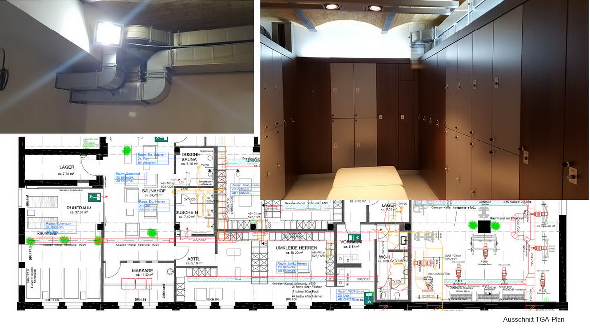 Die Kanalführung der neuen Lüftungsanlage zu integrieren war aufgrund der geringen Höhen unterhalb der Unterzüge von 2,25m extrem schwierig. Auf den Fotos ist die Situation in der Umkleide dargestellt, hier war auch die Kreativität des Schreiners gefragt.
