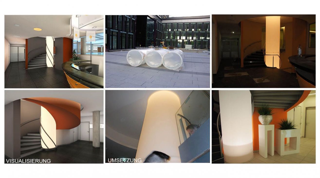 Um die Wirkung der Elemente vorab darzustellen, haben wir diese visualisiert (oben). Die Umsetzung sieht man dann unten in den Fotos.