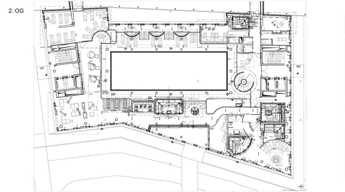 Durch das Einziehen einer Galerieebene entstand genügend Platz um alle Bereiche unterzubringen. Auch eine Physiotherapie konnte baulich sinnvoll in einem der späteren Anbauten von 1996 umgesetzt werden (unten links). Auf der anderen Seite sind die Umkleiden und der Wellnessbereich ebenfalls in Anbauten geschickt integriert.