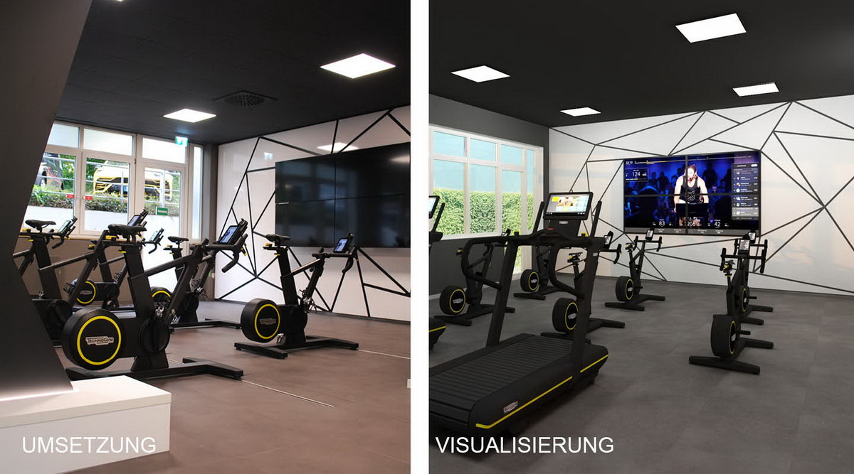Die Monitorwand für Cyber Cycling ist wirkungsvoll im Raum oder auf der Fläche.