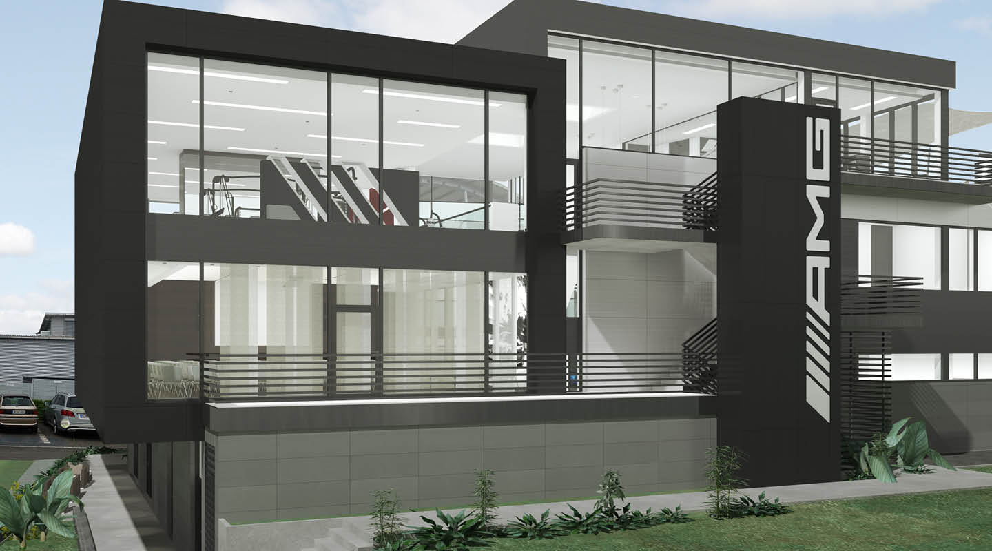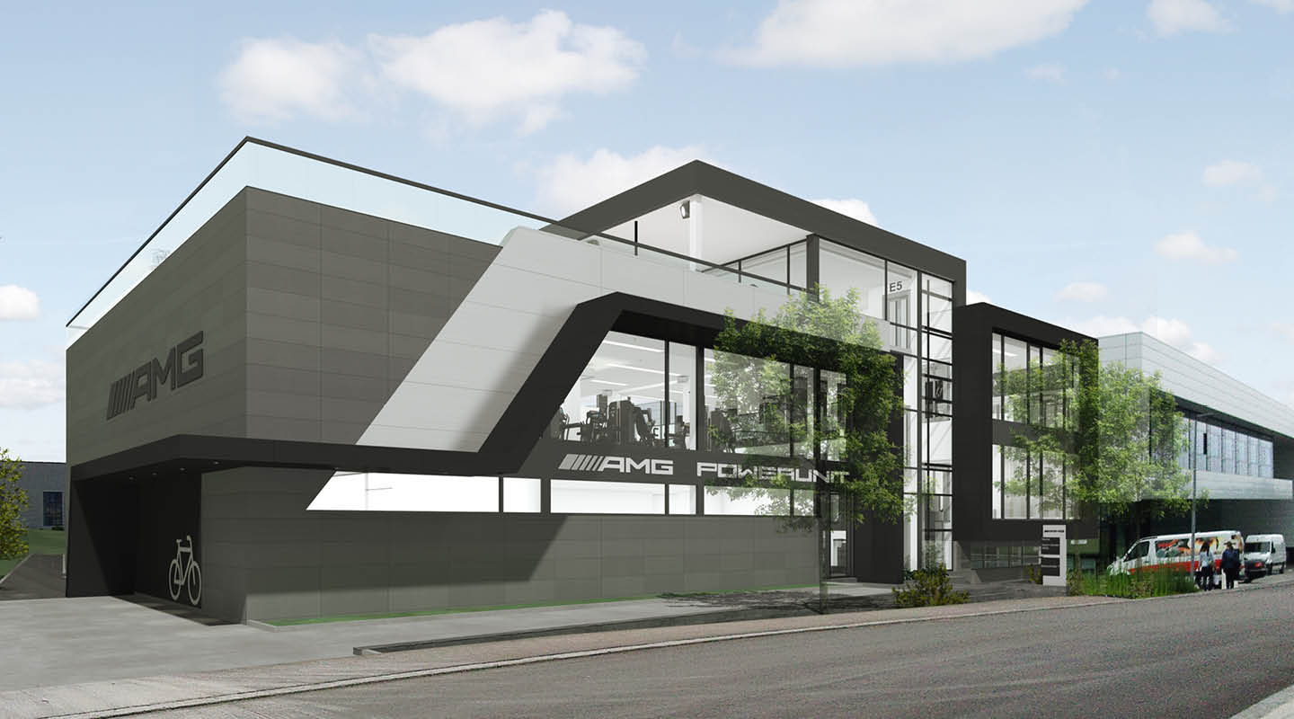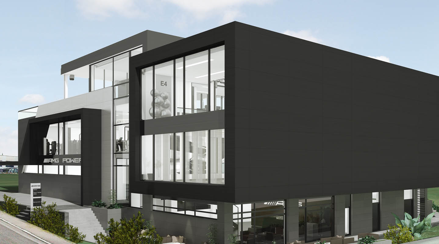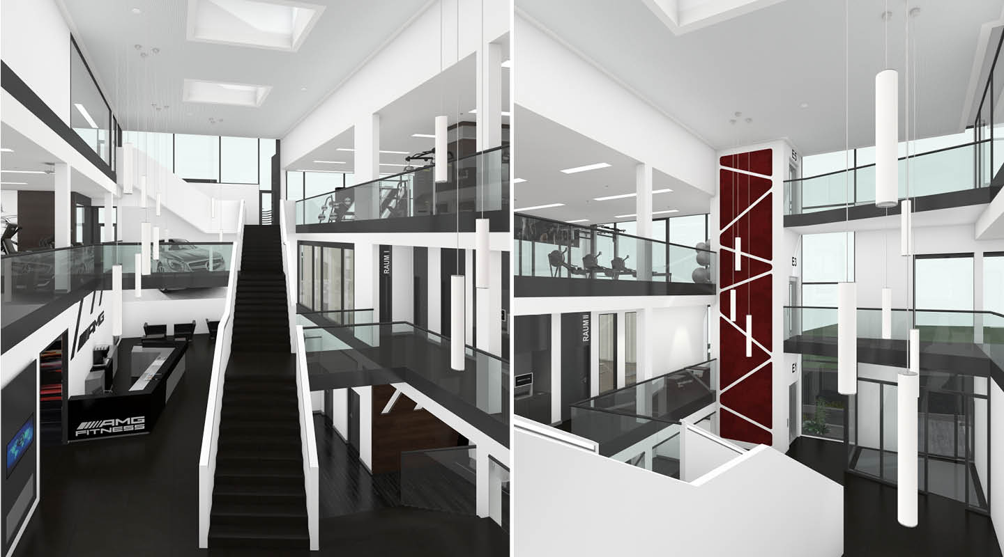 Für AMG haben wir 2014 eine Corporate Fitnessanlage mit Gastronomie und Seminarräumen als Neubau neben dem Logistikzentrum geplant.
