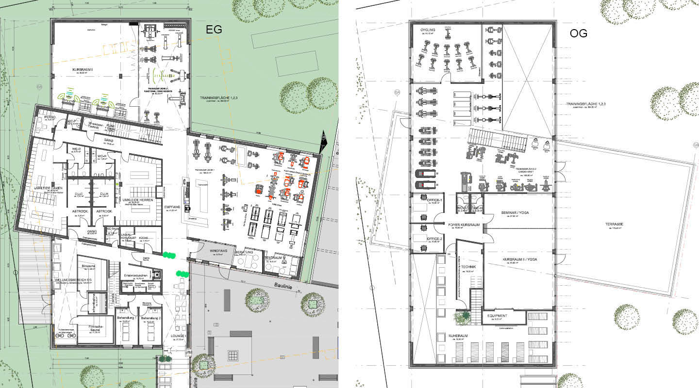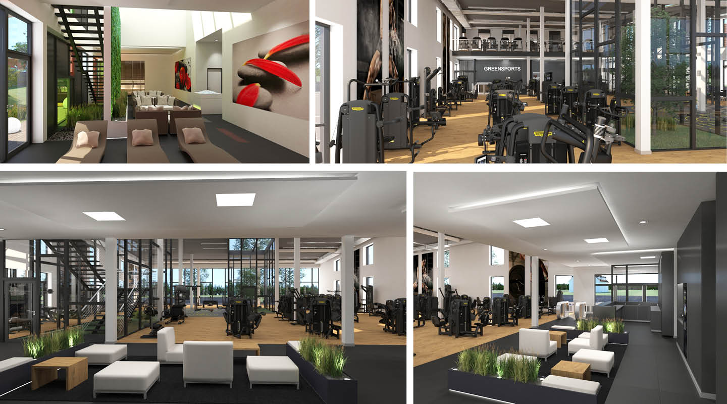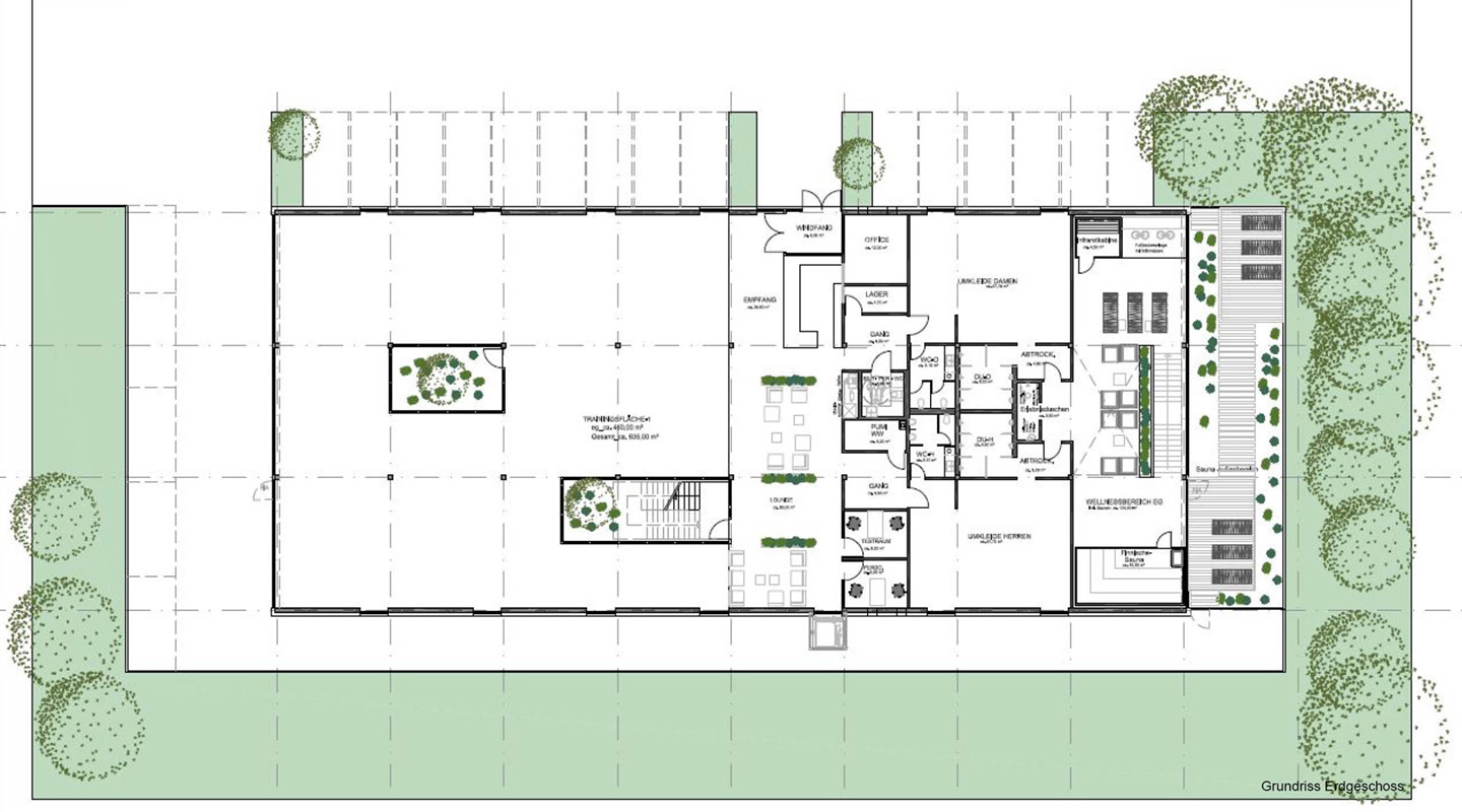 Einzelne Module, wie Wellnessbereich und Kursraum sowie Teile der Trainingsfläche können in Form einer ganzen Achsbreite hinzugenommen oder weggelassen werden.