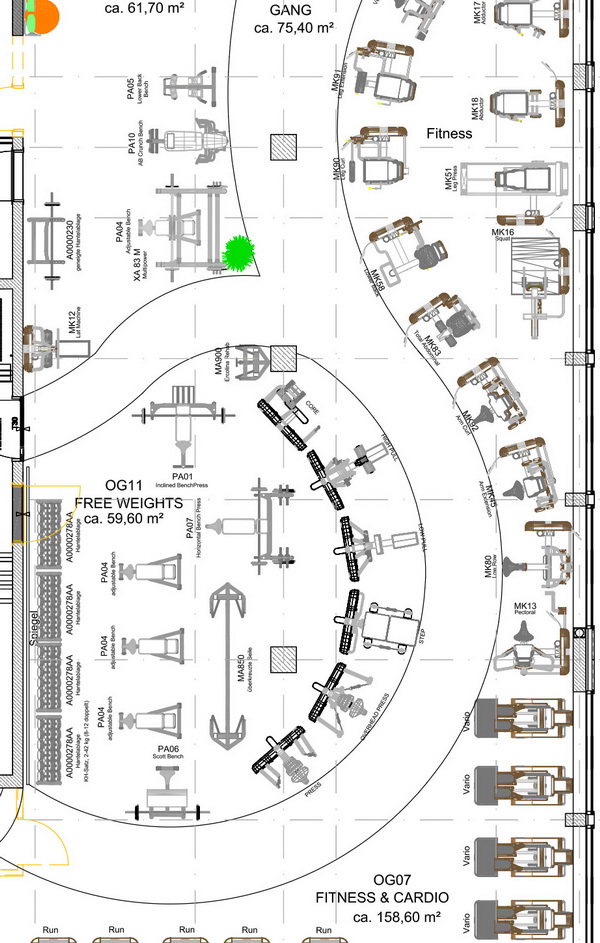 Da viele Geräte Strom, LAN und bei Cardio-Geräten oft einen TV-Anschluss benötigen, macht es noch mehr Sinn, den Stellplan vorab zu finalisieren, um die ELT-Anschlüsse einzuplanen, idealerweise in Form von Bodendosen. Es gibt jedoch auch andere Möglichkeiten, um die Kabel unsichtbar zu halten, wie z.B. Raumteiler oder Sitzbänke, in denen Kabel und Steckdosen verlegt werden können. Das Ziel sollte immer sein, keine Kabel auf der Trainingsfläche zu sehen.