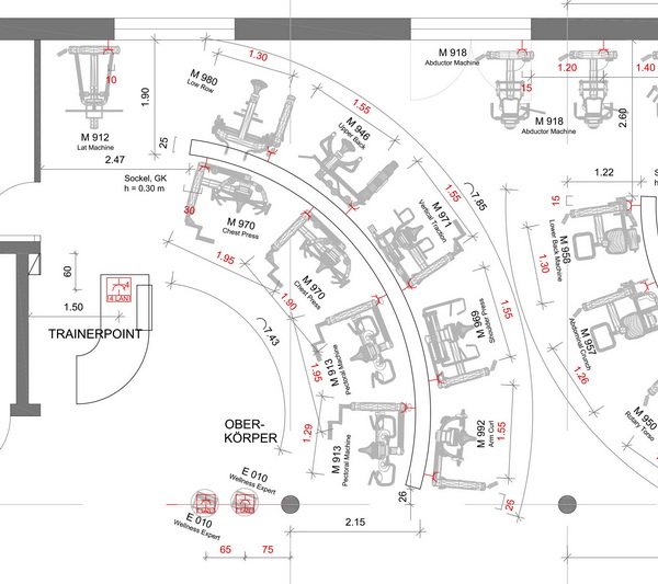 Wir berücksichtigen, wie man sich als Trainierender auf dem Gerät fühlt, was man sieht und wie man gesehen wird. Die individuelle Optik eines Gerätes mit Höhe des Gewichtspaketes, Farbe und Material spielt ebenfalls eine Rolle. Noch wichtiger ist die Funktion. So kann man je nach Konzept Bereiche mit Gruppierungen schaffen, in denen der Kunde bestimmte Trainingsinhalte umsetzen kann. Dies kann auch eine Kombination von geführten und freien Übungen sein.